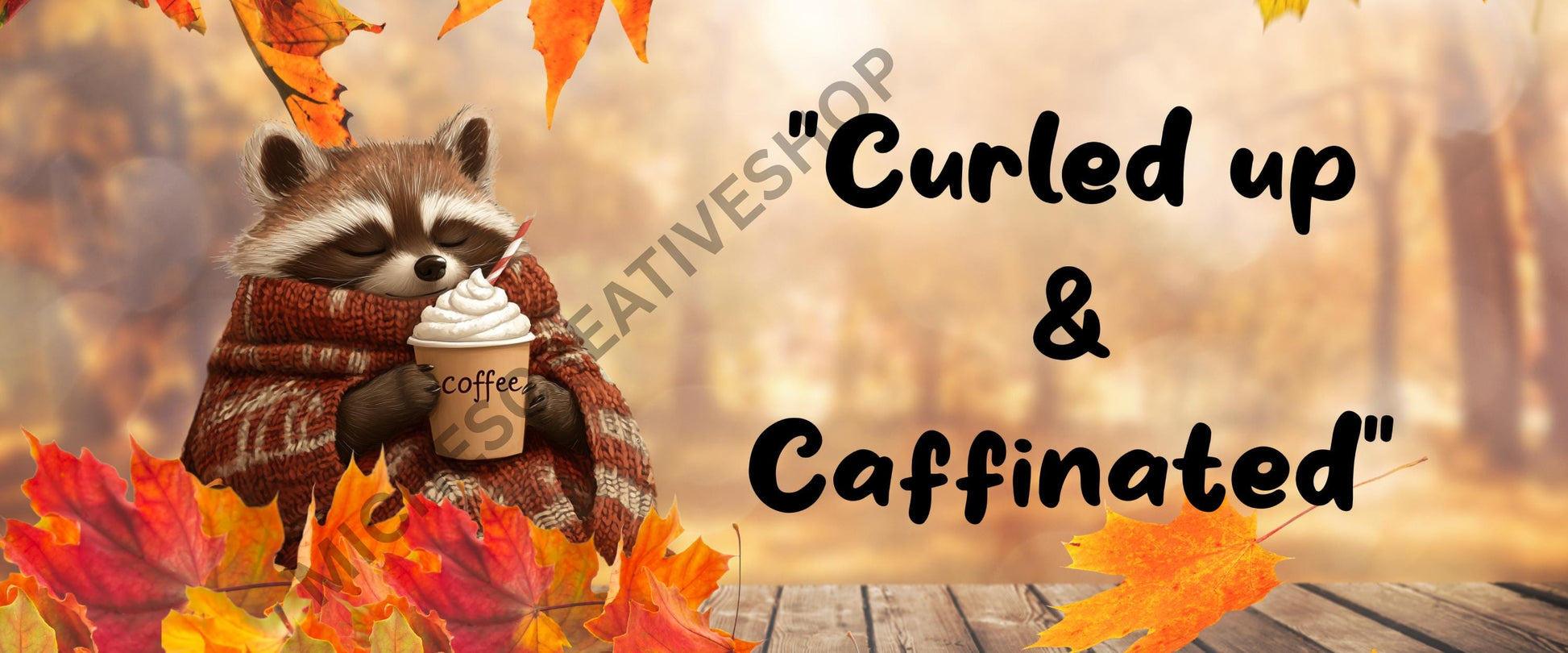 Get cozy with this adorable autumn-themed digital art featuring a chubby raccoon snuggled in a knitted sweater, holding a whipped cream-topped coffee with eyes blissfully closed. Surrounded by vibrant fall leaves and warm woodland vibes, this design perfectly captures the feeling of being "Curled up & Caffeinated."