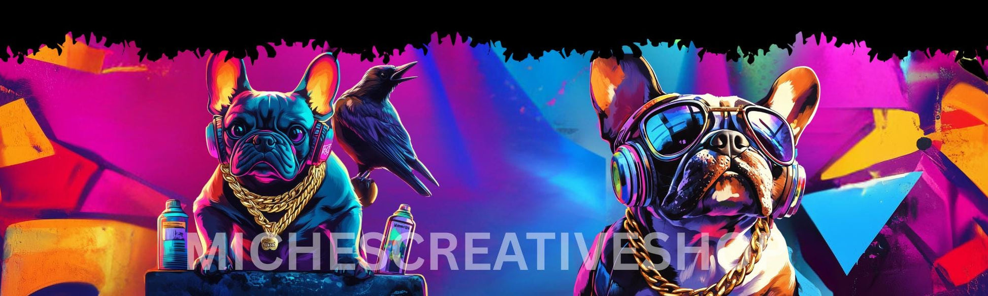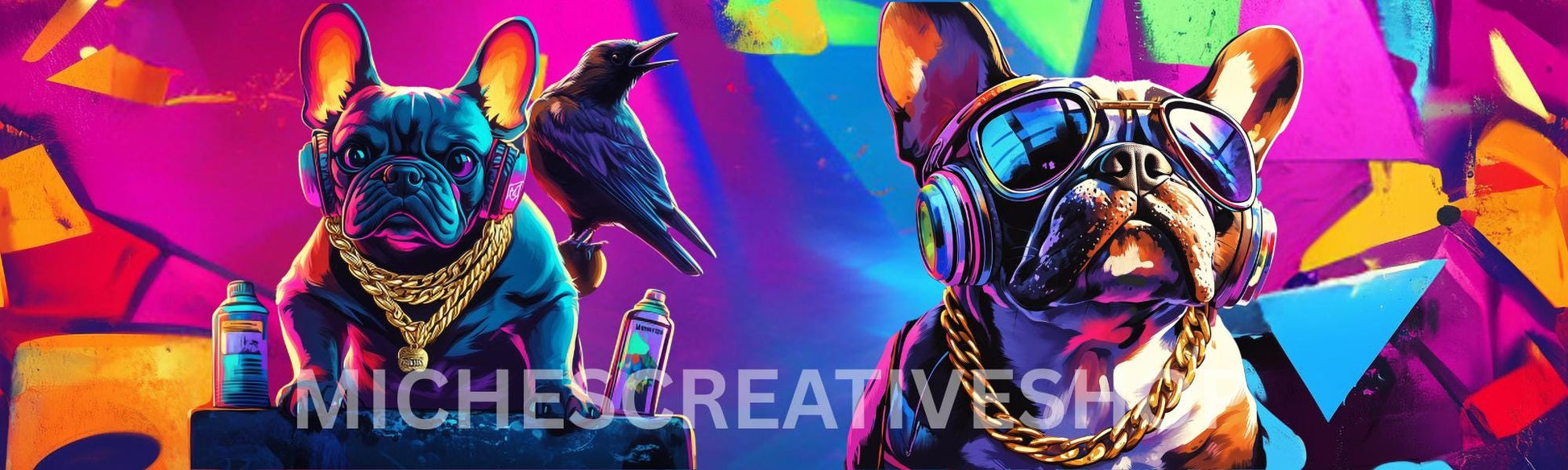 Turn heads with this bold and badass 40 oz tumbler wrap featuring a hip hop French Bulldog! This digital design bursts with neon graffiti vibes — complete with gold chains, spray cans, oversized sunglasses, and a raven for extra edge. Perfect for dog lovers, street art fans, and anyone who wants to add some serious attitude to their drinkware.